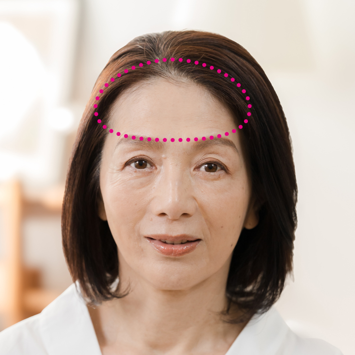 刺激してうねる前髪を改善おでこ周辺は早い段階で細毛になりやすいため、丁寧なマッサージを習慣付けましょう。「生え際とおでこ(下写真囲み部分)を指の腹でほぐして、前髪の細毛やうねりの改善を目指しましょう。ほぐすことでこの部分の筋肉も鍛えられるので、肌のたるみ予防にも」(SAKIさん)