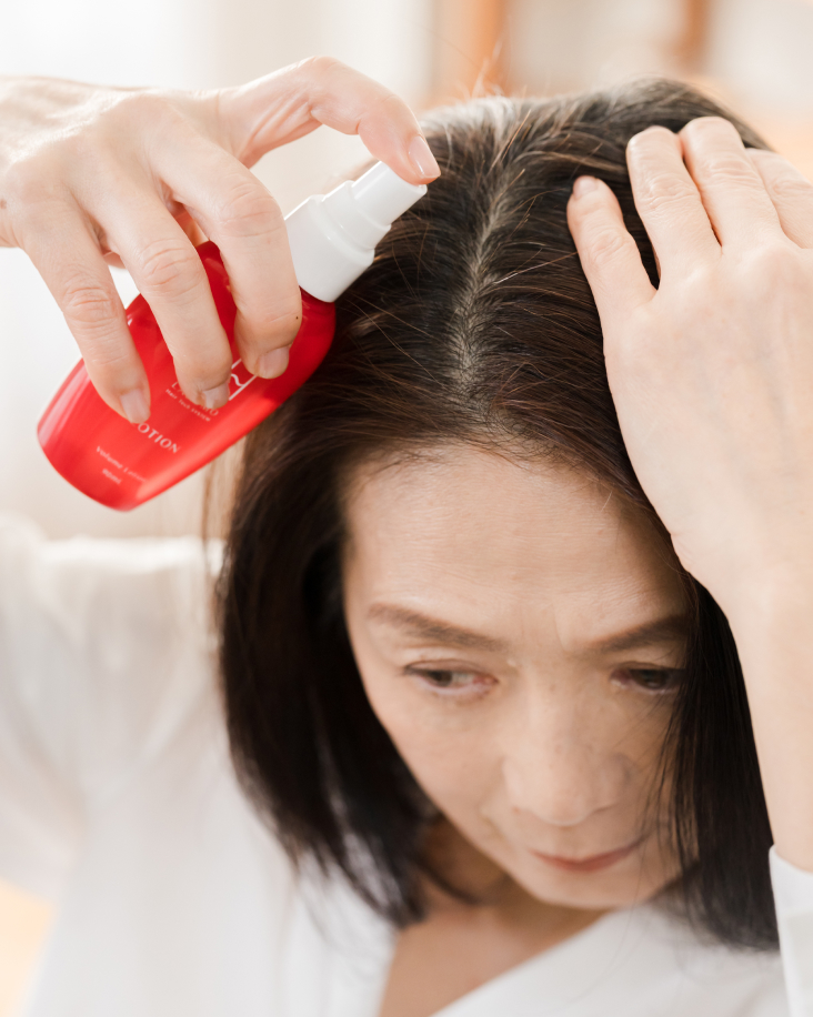 しっかりマッサージ髪のエイジング※が進むと、分け目の幅が広くなるなど見た目にもわかりやすい変化が起こります。「頭皮ローションはきちんと分け目を開いて地肌に届くように塗布します。また、トップが硬く張った感じのする人は、コリが溜まった状態。分け目周辺までしっかりほぐすことで巡りを整えていきましょう」(SAKIさん)