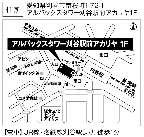 - 愛知県刈谷市南桜町1-72-1 アルバックスタワー刈谷駅前アカリヤ1F