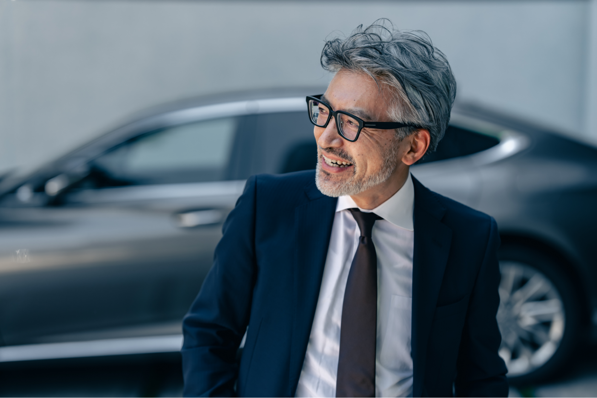 オールバックであえて額をすっきりと出しておしゃれなメガネをかければ、薄毛を強みにしたスタイルの完成です。